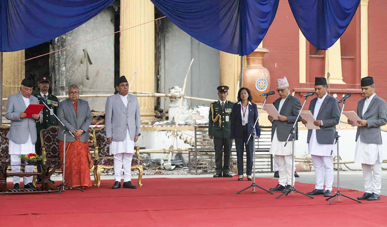 काठमाडौं, ३० भदौ । राष्ट्रपति कार्यालयको खण्डहर भवन बाहिर सोमबार नवनियुक्त तीन मन्त्रीहरूले शपथ लिएका छन् । प्रधानमन्त्री सुशीला कार्कीको उपस्थितीमा राष्ट्रपति रामचन्द्र पौडेलबाट शपथ लिएका हुन् ।जेनजी आन्दोलनका क्रममा आगजनी भएपछि शीतल निवास पनि बस्न नमिल्ने अवस्थामा पुगेको थियो । त्यसैले गत शुक्रबार प्रधानमन्त्री सुशीला कार्कीको शपथ राष्ट्रपति निवास भित्रै भएको थियो ।आज चाहिँ खण्डहर कार्यालय बाहिर पाल टाँगेर मन्त्रीको शपथ कार्यक्रमको व्यवस्थापन मिलाइएको हो । आजको शपथमा अन्य अतिथीहरुलाई पनि बोलाइएको छ । सरकारी निकाय र कूटनीतिक नियोगका प्रमुखहरु पनि शपथमा उपस्थित छन् । आज तीन मन्त्रीहरू अर्थमन्त्री रामेश्वर खनाल, ऊर्जा, भौतिक योजान र सहरी विकासमन्त्री कुलमान घिसिङ र गृह र कानुनमन्त्री ओमप्रकाश अर्यालको शपथ भएको हो ।घिसिङलाई तीन र अर्याललाई दुई मन्त्रालयको जिम्मेवारी दिइएको छ ।
